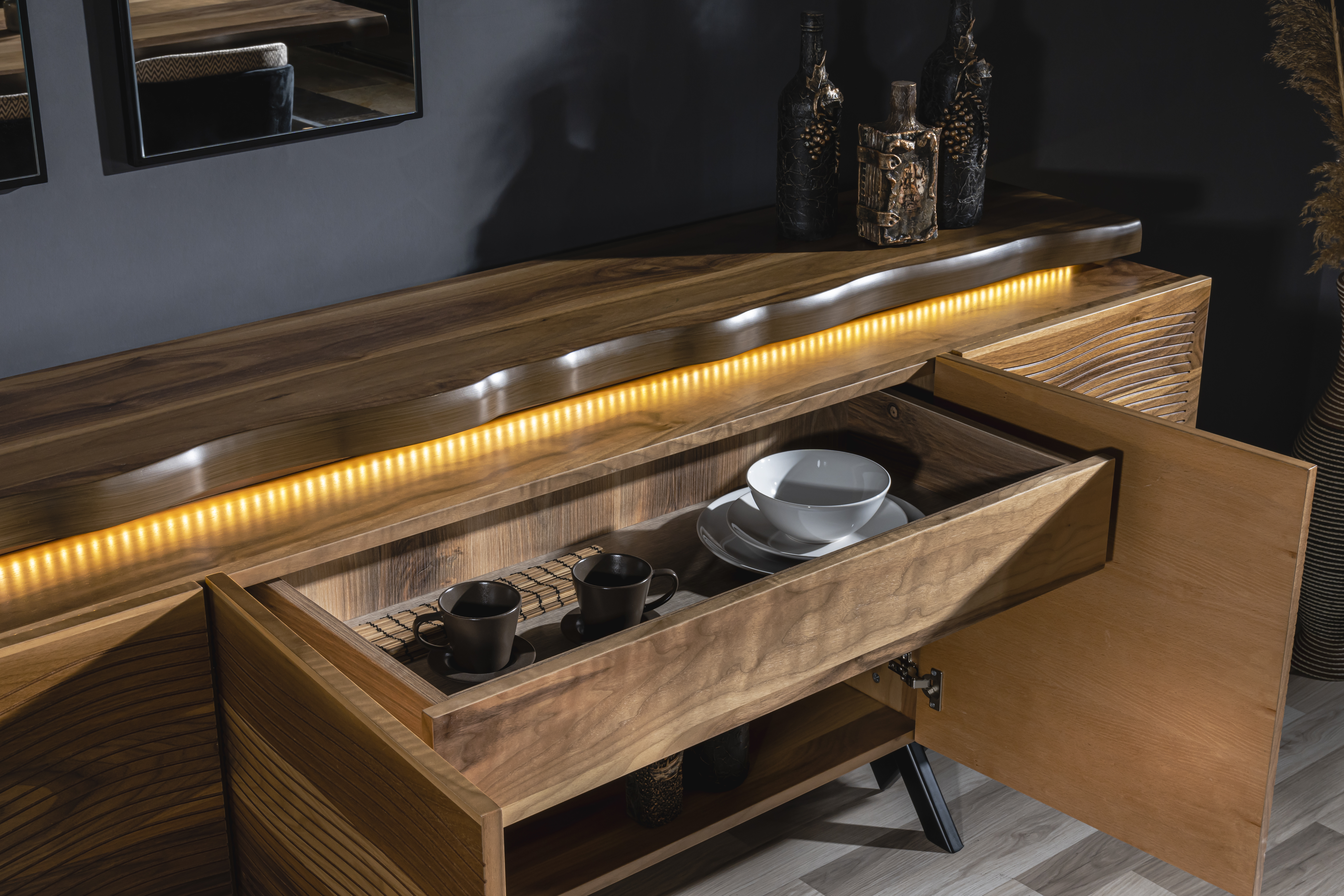 Konsolda geniş depolama + LED’li sofistike görünüm